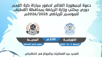دعوة نادي الخويلدية يدعو جماهيره الغالية وعشاق كرة القدم للحضور ومساندة الفريق الأول في أولى مبارياته أمام الأشقاء نادي المحيط…